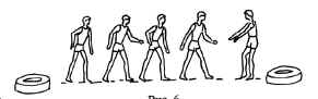 в колоннах по одному (группа за группой) по кругу.