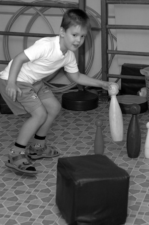 У каждого игрока в руках небольшой мяч. Первый участник бежит вперед до линии и оттуда начинает бросать мяч по кеглям, стоящим впереди на расстоянии 30–40 см друг от друга, затем возвращается к своей команде, передавая эстафету следующему участнику.
