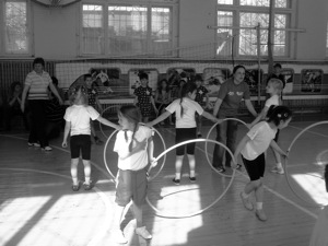 Первый участник команды встает внутрь обруча, держит его руками и так пробегает эстафету. Вернувшись к своей команде, он впускает в обруч второго участника, и они бегут вдвоем, затем – третьего, и так до тех пор, пока вся команда не окажется в обруче. Если все не помещаются внутри обруча, то они держатся за его края.