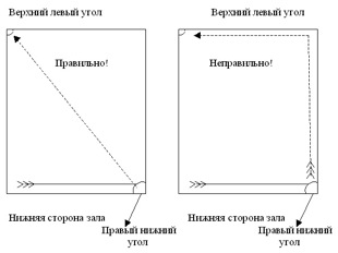 После четкого и образного объяснения сначала отдельные дети, затем несколько или весь строй показывают, как надо выполнять упражнение. Затем передвижение по диагонали начинается с места, когда направляющий стоит в одном из углов, и после этого – в движении.