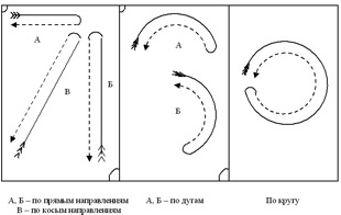 • по прямым, косым направлениям, дугам, по кругу;