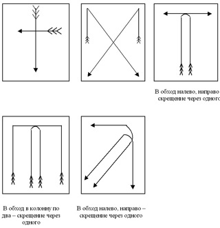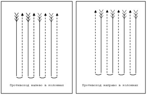 Во втором случае подается команда: «В колонну по два, налево и направо в обход (противоходом) – марш!». Первая пара идет налево, вторая – направо, и т.д.