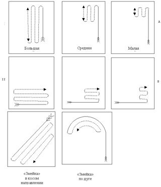 «Змейка» – это передвижение противоходами попеременно налево и направо. Она строится по прямым – продольно, поперек; по косым направлениям и дугам (рис. 14).