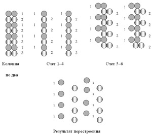 Перестроение выполняется по команде: «В колонну по четыре уступами – стройся!». Обе колонны на четыре счета выполняют два шага от середины в стороны, затем на счет 5–6 первые номера каждой колонны – один шаг влево, вторые номера каждой колонны – один шаг вправо (рис. 6).